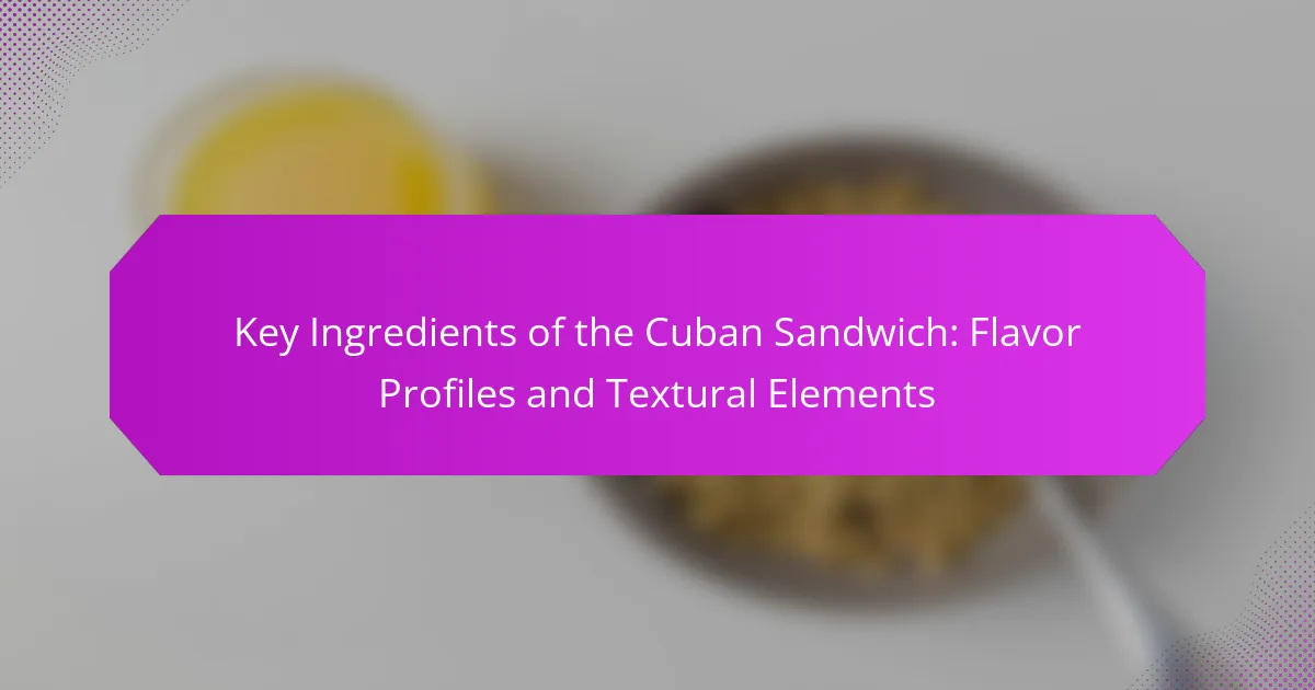 The key ingredients of a Cuban sandwich include Cuban bread, roast pork, ham, Swiss cheese, pickles, and mustard. Cuban bread is essential for its unique texture and flavor. Roast pork provides a savory, tender component. Ham adds a salty contrast to the sandwich. Swiss cheese melts beautifully, enhancing the overall taste. Pickles contribute a tangy crunch. Mustard adds a zesty kick, completing the flavor profile. Each ingredient plays a vital role in creating the classic Cuban sandwich experience.