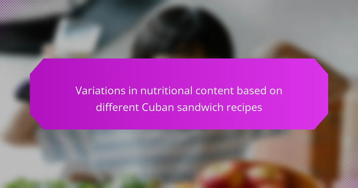 Cuban sandwiches are a popular culinary entity characterized by their diverse recipes that reflect regional preferences and ingredient availability. The classic Cuban sandwich typically includes Cuban bread, roast pork, ham, Swiss cheese, pickles, and mustard, while variations may incorporate additional ingredients such as salami or vegetarian substitutes like grilled vegetables. Each recipe impacts the nutritional profile, with traditional versions averaging around 500 calories, while alternatives like the Medianoche or Cubanito can alter calorie and fat content significantly. Understanding these variations is essential for selecting recipes that align with dietary needs, and adjustments can be made to enhance nutritional value without sacrificing flavor.